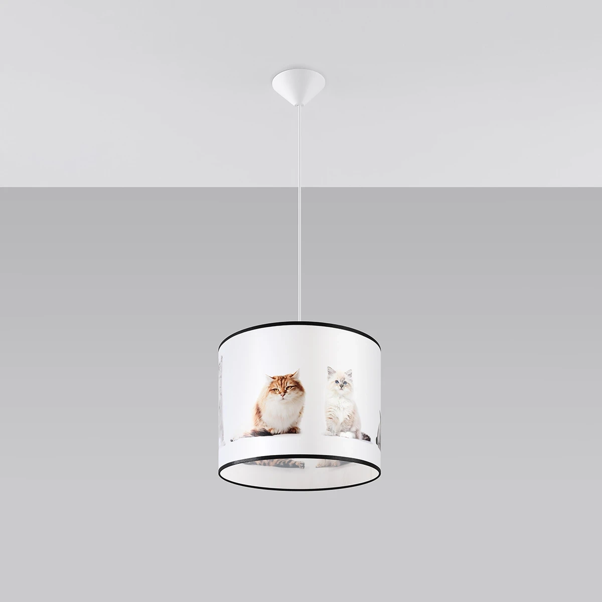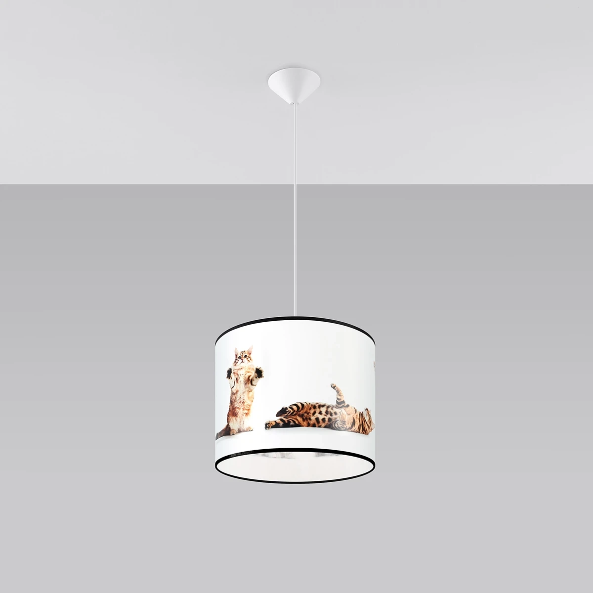 La lámpara colgante para habitación infantil KOTY está disponible en 2 tamaños: con pantalla de 30 cm y 40 cm de diámetro. Esto te permite adaptarla mejor al tamaño de la habitación. Nada le impide crear composiciones de iluminación a partir de varias lámparas: ¡tantas ideas, tantas posibilidades!